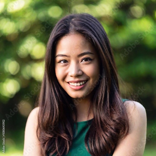 detailed photo image of Asian girl with brunette hair, using soft focus. green abstract background