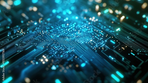 detailed shot of a circuit board with techno dots representing electronic connections.