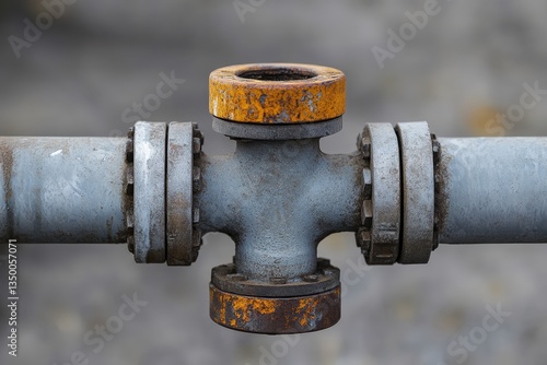 pipe, metal, steel, industrial, construction, corroded, rust, flange, joint, connection, fitting, valva, junction, tee, grey, yellow, round, tube, hardware, equipment, infrastructure, engineering, manufacturing, production, structure, dirty, old, damaged, weathered, surface, detail, close, bolt, nut, macro, abstract, background, texture, industrialization, element, design, system, mechanical, pressure, flow, section, assembly, corrosion