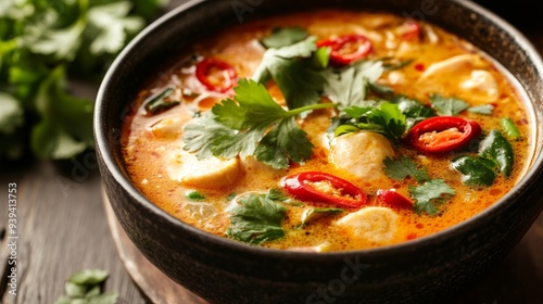 Detailed view of a hot bowl of Tom Yum Goong with vibrant red chili slices and fresh cilantro, served in a traditional Thai bowl