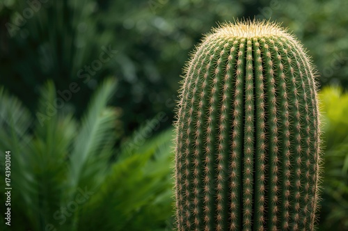Detailed view of a massive barrel cactus showcasing texture and vibrant greenery in a natural setting