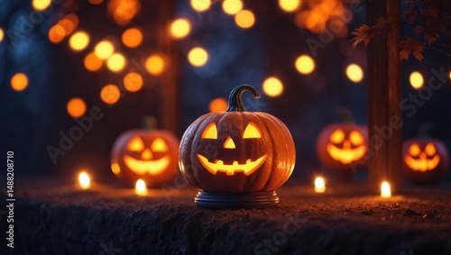 Detailed View of Illuminated Jack-O'-Lantern Halloween Ornament on Dark Backdrop
