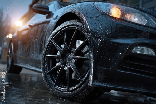 vehicle, car, automobile, transportation, auto, wheel, tire, road, performance, luxury, sport, black, shiny, wet, water, droplet, rain, clean, headlamp, speed, rim, spoke, modern, style, automotive, quarter, panel, street, drive, design, gloss, dark, machine, detail, exterior, urban, surface, powerful, ride, metallic, weather, motion