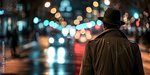 Detective in hat and coat standing on street at night. Concept Film Noir, Detective, Night Scene, Mystery, Vintage Fashion