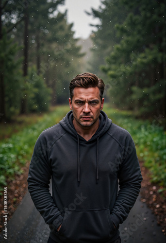 man, determination, forest, rain, natural light, moody, strong, hoodie, male, adult, intense, path, emotional, green, tree, blurred, photorealistic, sharpened, depth, portrait, stillness, wilderness, expression, solitude, nature, outdoors, atmosphere, strength, resilience, depth of field, no people, adult male, wet, mist, ambient, aethereal, journey, calm, adventure, contemplation, brook, shadow, fog, environment, movement