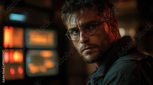 man, determined, night, urban, gaze, intense, goggles, film, still, screen, city, dark, serious, portrait, face, look, expression, eye, male, adult, person, closeup, head shot, focused, thoughtful, strong, powerful, mystery, action, adventure, dramatic, gritty, spy, soldier, hero, suspense, security, investigation, search, danger, tension, shadow, street, background, lighting, mood, atmosphere