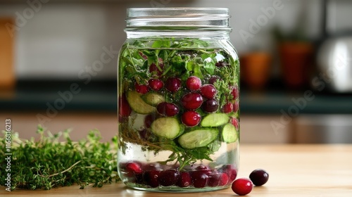 Detox infused water with cranberries cucumber and fresh herbs in a glass jar on a wooden table for healthy hydration options
