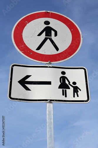 ban, forbidden, pedestrian, pedestrian, traffic sign, road traffic, road traffic, german, german, driving school, hint, information board, plate, communication, roadsign, signs, street, street, infrastructure, round, sidewalk, arrow, link, family, segregation, separate, footway, paseo, detour
