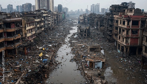 Devastated urban landscape showcasing the aftermath of destruction in Mumbai, reflecting a chaotic scene amidst the ruins of a once vibrant city background.
