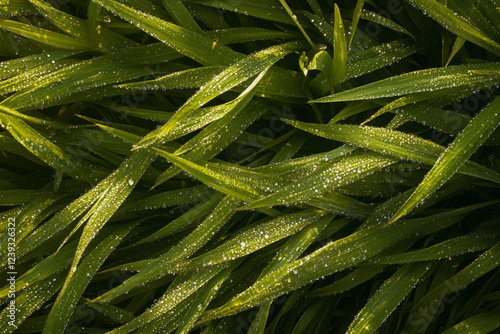 Dew-covered green grass in soft sunlight, natural macro texture. A high-resolution organic background for spring, freshness, and environmental themes.