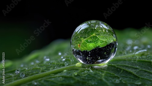 Dewdrop reflecting leaf, macro shot, dark background, nature photography, website banner