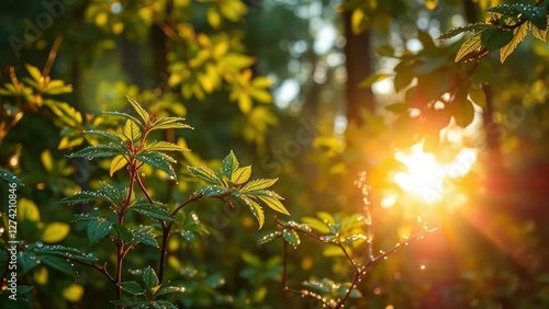Dew-kissed forest leaves glowing in the sunlight, foliage, dew, dappled light