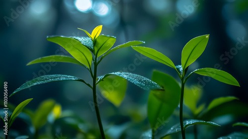 plant, plant, leaf, green leaf, green plant, new growth, germinating, sprout, germ bud, forest, timberland, wood, nature, natural, environment, ecology, flora, botanical, botany, closeup, macro, detail, vibrant, lush, fresh, dew, water droplets, morning dew, sunlight, light, bokeh, background, texture, pattern, spring, summer, growth, life, rebirth, renewal, emerald green, teal, dark green