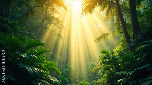 tropical, jungle, rainforest, sunlight, sunbeam, foliage, lush, greenery, exotic, paradise, nature, vibrant, orange flower, dew-drop, sparkling, dense forest, wild, botanical, natural light, serene, magical, pristine, misty, flora, fauna, eco, untouched, wilderness, moisture, morning light, summer, adventure, peaceful, biodiversity, fresh, organic, ecosystem