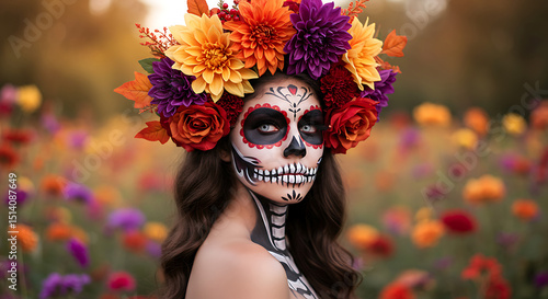 day of the dead, woman, portrait, tradition, celebration, holiday, festival, make-up, beauty, model, outdoors, flower field, colourful, skull, costume, event, headpiece, autumn, october, november, remembrance, honour, deceased, soul, vibrant, festive, art, ritual, custom, head shot, symbolic, cultural, traditional, folk art, floral, rose, autumn leaf