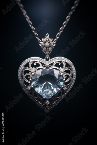 diamond necklace on black background - Heart shaped - fantasy necklace hanging from chain - misty dark background