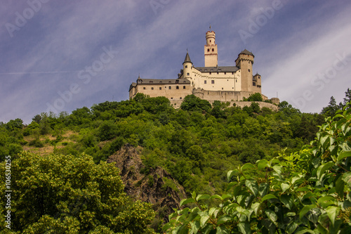 rhine, castle, fortress, german, lahn, pfalz, rhineland-palatinate, romantic, tour tourism, unesco, world heritage, tower, hillside, park, shrub, heaven, blue, cloud, shrub