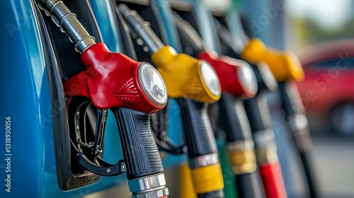 Diesel fuel nozzles at a refueling station macro shot for transportation and energy themes