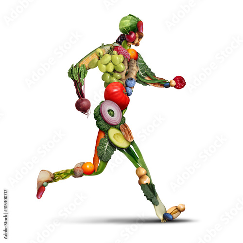 Diet and fitness as a healthy lifestyle of exercise and eating fruits and vegetables to lose weight as a person running or jogging made of fresh produce