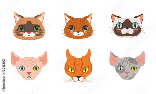 Different Cat Muzzle and Heads with Whiskers Vector Set