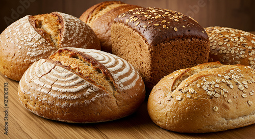 Different kinds of bread with nutrition whole grains on wooden background. Food and bakery in kitchen concept. Delicious breakfast gouemet and meal.