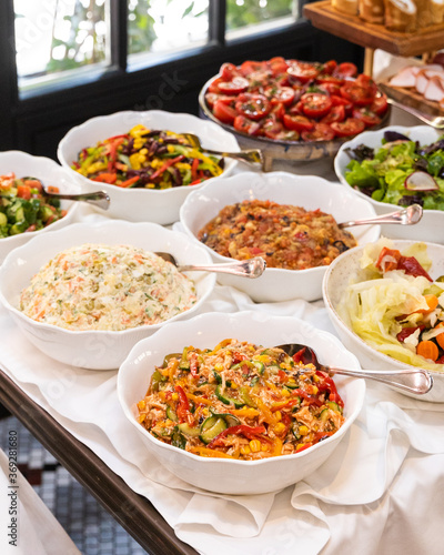 Different salads on the white table