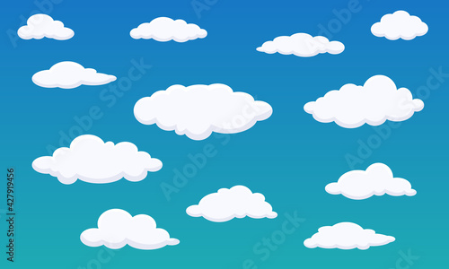 Different shape cartoon white clouds on blue background. Vector decoration element.