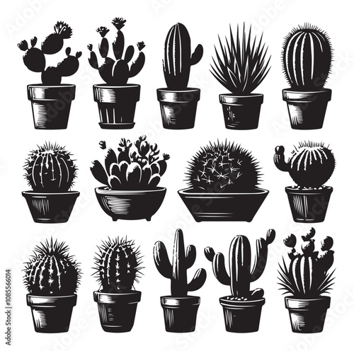 cactus, silhouette, western, collection, set, succulent, wild, botany, dry, plant, desert, graphic, growth, southwest, spine, type, variation, 6, botanical, cut-out, different, drawing, sharp, arid, barrel