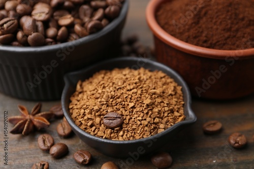 Different types of instant coffee and beans in bowls on wooden table, closeup
