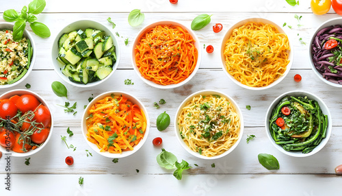 different, vegetable, noodle, bowl, white, wooden, table, flat, lay, vegetarian, dish, pasta, healthy, nourishment, colourful, variety, courgette, carrot, fresh, raw, diet, wellness, fitness, low, carb, gluten, free, rainbow, vibrant, cooking, preparation, ingredient, kitchen, utensil, clean, eating, lifestyle, organic, natural, mediterranean, asian, fusion