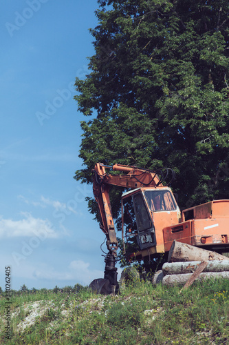work, wood, tree, object, nobody, metal, machinery, machine, large, industry, industrial, hydraulic, heavy, excavation, equipment, digging, shoveling, bulldozer