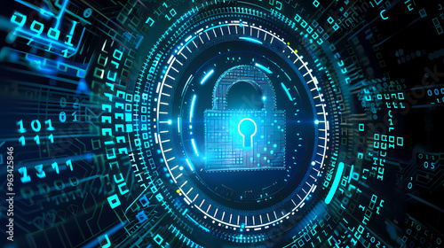 digital and futuristic cyber security. Central to the image is a glowing blue lock symbol, representing security and data protection.