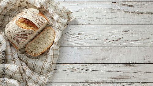 digital art, white washed wooden surface with a slice of freshly baked bread on a rustic plaid towel, scrapbooking, frame, a lot of free space for text colored by [milky white]