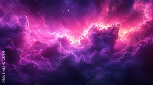Digital artwork depicting a vibrant cosmic scene features swirling clouds of nebulae in shades of pink and purple blend seamlessly, with bright highlights and deep shadows adding depth and contrast