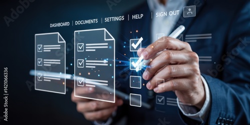 digital, checklist, interface, task, management, workflow, document, setting, dashboard, signs, out, help, approval, form, process, review, compliance, progress, monitoring, system, user, hand, business, technology, screen, input, control, computer, datum, information, project, organisation, productivity, efficiency, performance, interactive, virtual, electronic