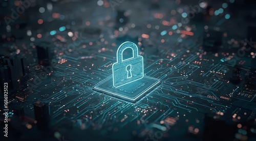 Digital Circuit Board with Illuminated Lock Icon Representing Cybersecurity