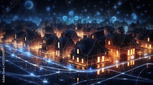 Digital Community Concept with Smart Houses, Smart City and Wireless Communication Network, Real Estate and Urban Innovation Concept with City Lights. 3D Illustration of Future City.