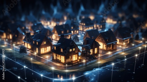 Digital Community Concept with Smart Houses. Smart city and wireless communication network. Real estate concept. Smart city concept with smart houses and city lights. Mockup city. 3d illustration.