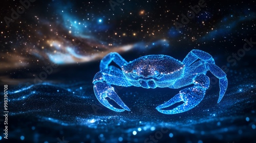 crab, cosmic, blue, holographic, ocean, galaxy, nature, abstract, underwater, illuminated, technology, aquatic, starry sky, digital artwork, marine life
