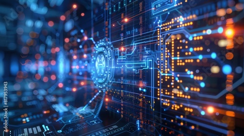Digital currency exchange with holographic screens, modern, blue and white, vector art, sleek