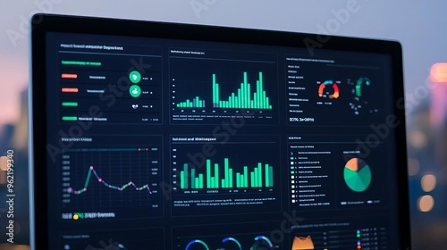 Digital dashboard showing real-time sustainability metrics, data-driven green strategy, business intelligence for sustainability