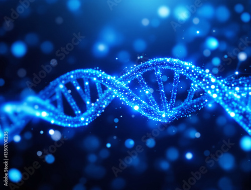 Digital depiction of a glowing DNA strand composed of tiny light particles, set against a deep blue abstract background. Concept of genetics and biotechnology. Ai generative