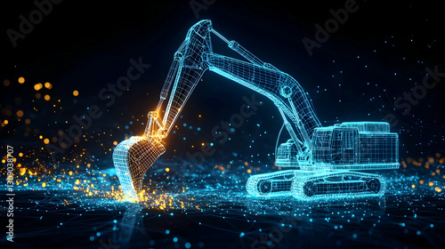 shoveling, digital, technology, abstract, construction, machine, datum, mining, engineering, future, network, industry, concept, cyber, innovation, automation, visualisation, modern, blue, light, energy, artificial, intelligence, equipment, process, structure, outline, dot, pixel, connectivity, communication, transport, infrastructure, mechanism, virtual, metallic, geometric, simulation, analysis, system, motion, background, dark, effect, electricity, power, spark