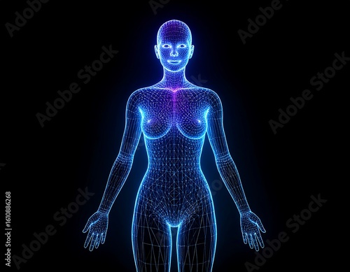 Digital female figure, wireframe, glowing