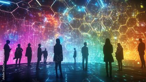 digital hexagonal network diagram with human silhouettes, representing a highly connected global social community