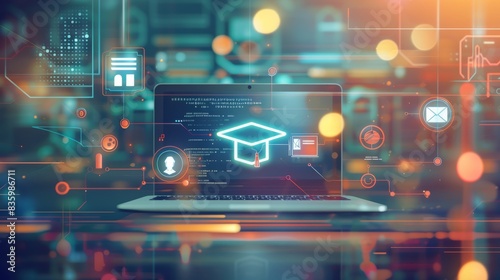 Digital icon of online education with icons and elements on a blurred background, including a laptop screen displaying an animated graduation cap symbol in the center