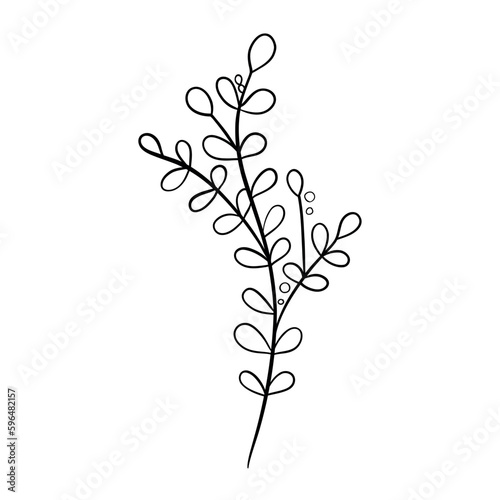 Digital illustration of a cute black outline doodle spring theme frame twig with leaves in scandinavian style. Print for clothes, poster, banner, postcard, web design, coloring.