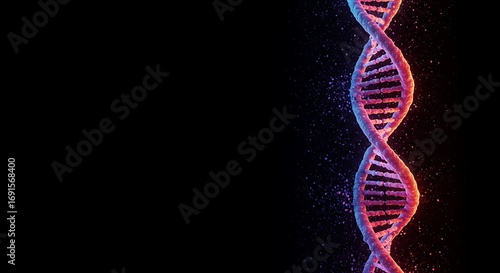 Digital illustration of a luminous DNA molecule representing genetic code, biotechnology, and scientific advancement on a black background
