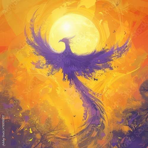 illustration, violet, phoenix, yellow, sunrise, symbolize, rebirth, art, mythical, bird, creative, fantasy, stunning, feather, artwork, divine, majestic, enchant, cosmic, mystical, design, element, magical, renewal, artistic, aura, celestial, sacred, beautiful