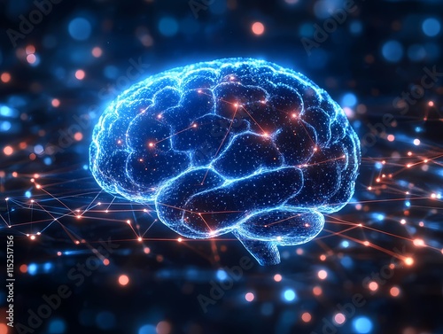 Digital illustration of glowing brain with neural connections on network background. Futuristic visualization of artificial intelligence, neural networks and technology concepts.
